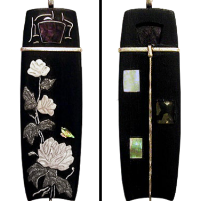 Коллекция: Китай Подвеска Пион Материалы: Серебро, Черное дерево, Бивень мамонта, перламутр, Гематит, Чароит, Эмаль серебряная Цена: 7 500 руб.