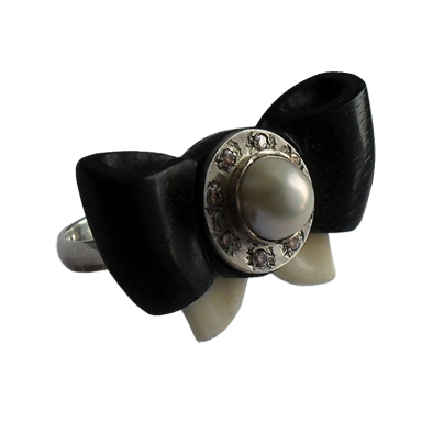 Коллекция: В стиле Коко Кольцо 304 (2) Бант Материалы: Серебро, Черное дерево, Жемчуг, Фианит Цена: 7 800 руб.